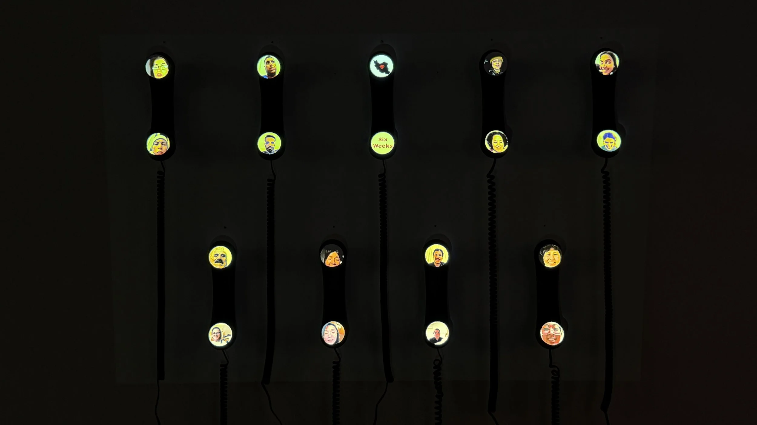 TimeZone is a collaborative project by Hadi Asgharpour and Maedeh Asgharpour that explores distance, migration, and the emotional weight of communication across borders. The installation uses old telephone handsets as sculptural objects onto which recorded video calls between immigrants and their family members are projected. One face appears on one end of the handset and the other on the opposite end, turning the phone into a carrier of presence, absence, and longing.